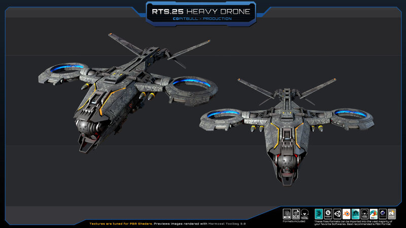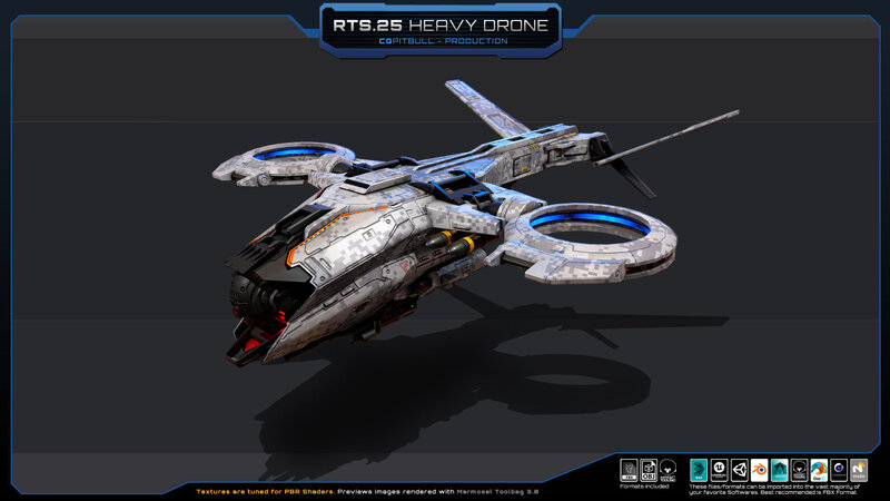 Set of one RTS.25 - Heavy Drone (FBX model). Separated parts: weapons, engines, sensors (NO landing gear included). No animated parts, FX, script or LOD. Check all previews, descriptions and video for full details before buying. (HANGAR in video and previews is NOT included, its just for Artistic purpose).