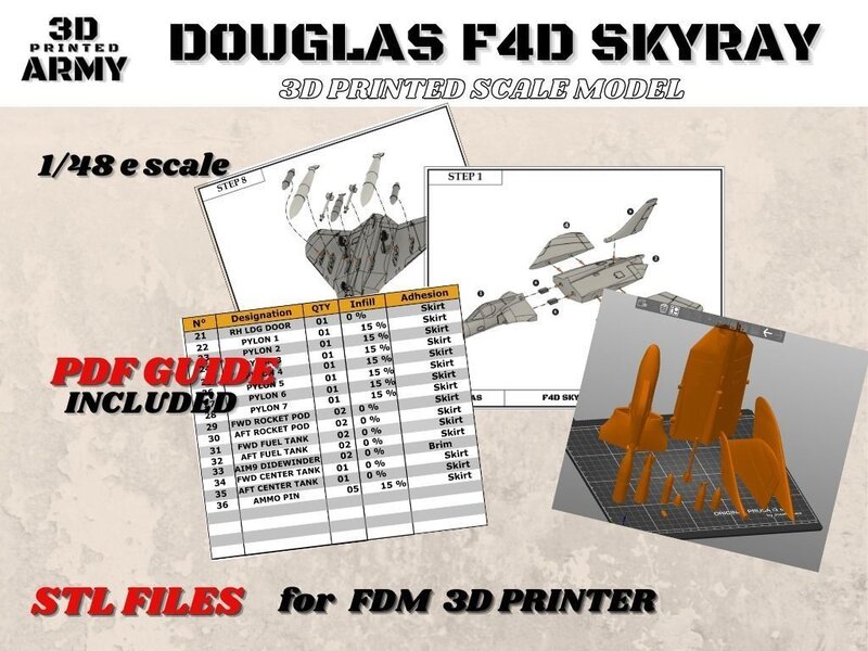 DOUGLAS F4D SKYRAY . It was in service for a relatively short time (1956–1964) and never entered combat but it was the first carrier-launched aircraft to hold the world's absolute speed record at 1211.744 km/h and the first US Navy and US Marines corps fight that could exceed MACH 1 in level flight It's very original and beautiful with his delta wing and equiped with external fuel tank , missiles and rocket pod a small PDF guide is provided to help you to print your model and to assemblr it correctly Take a look to my new Facebook page her : https://www.facebook.com/3DPrintedARMY like it and follow me for lot of new models and my Pinterest page here https://www.pinterest.fr/3DprintedARMY/_created/