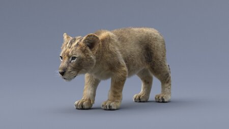 High-quality realistic and rigged Lion cub model with fur, it has Arnold materials with high-resolution textures. The Lion cub model has a clean topology and is good in one iteration of smoothing. The model has a custom rig and is ready for animation.