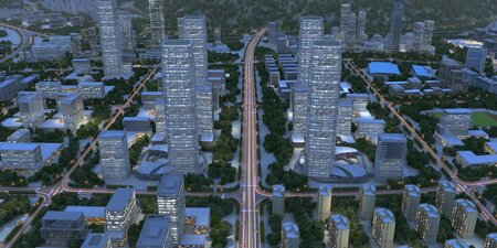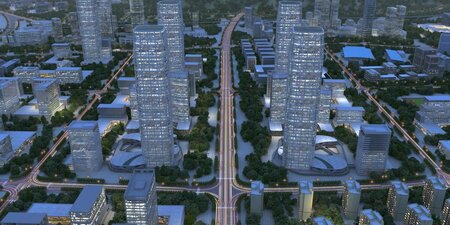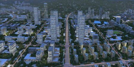 This is an architectural animation shot with a total duration of 200 frames. The scene is measured in meters, and all objects are located at the world coordinate origin. The scene was created in MAX2020, rendered using V-Ray 5.20. The roadside trees and large forest areas were generated using the MultiScatter 1.627 plugin. Both color and depth of field channels have been tested. The scene is very detailed, including various city buildings, roads, parks, plants, gardens, and commercial elements. The lighting has been tested, texture mapping is complete, all you need to do is click render. This shot can be used for any of your commercial projects such as movies, TV, advertisements, etc. The scene is quite large, to speed up viewport performance, it is recommended to hide objects outside the camera view. The FBX and OBJ models only include architectural structures and terrain.