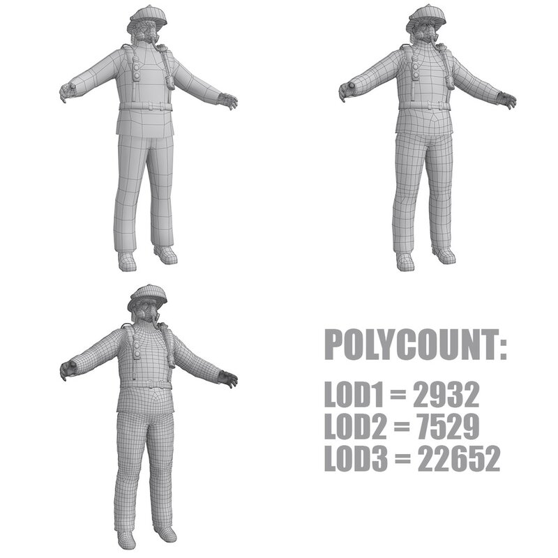 Model of Fireman in 3 level of details.