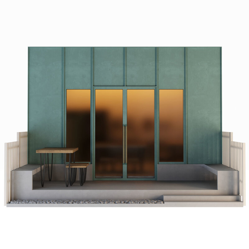 Entrance doors lined with aluminum panels with a matte green finish. The cladding has thick seams that give the façade a vertical rhythm. Cast concrete benches on both sides extend from the front to the edge of the patio.