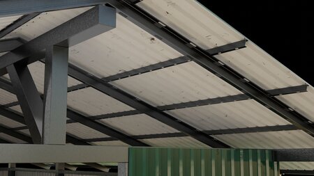 Metal profile shed or workshop for farms, scenery or other. One big metal door and one small wooden door to be opened or closed.