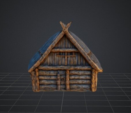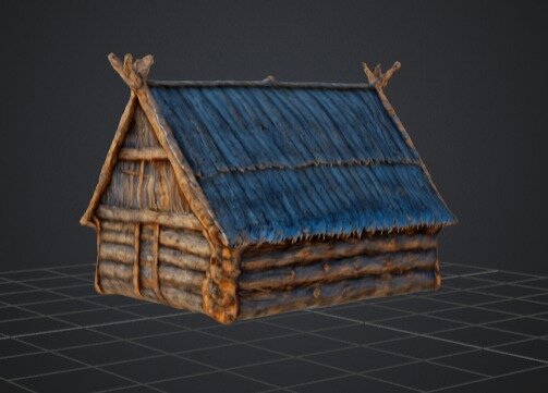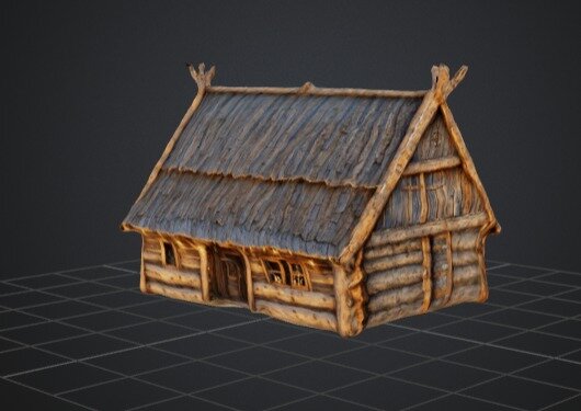 A detailed 3D model of a rustic wooden cabin with a weathered, log construction and a textured roof. This model is perfect for use in medieval, fantasy, or rural-themed environments in games, animations, or virtual reality projects. The cabin's authentic design adds a touch of realism and charm, making it an excellent choice for creating immersive and historically inspired scenes.