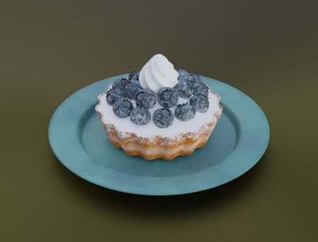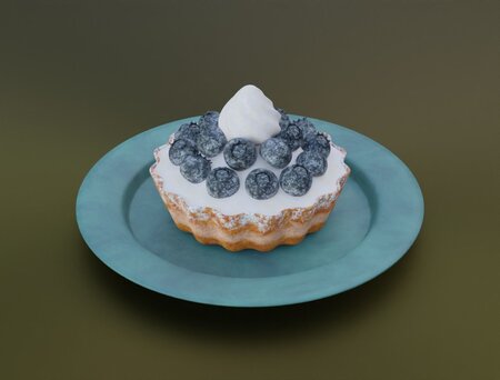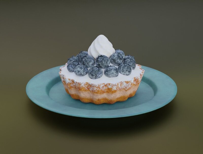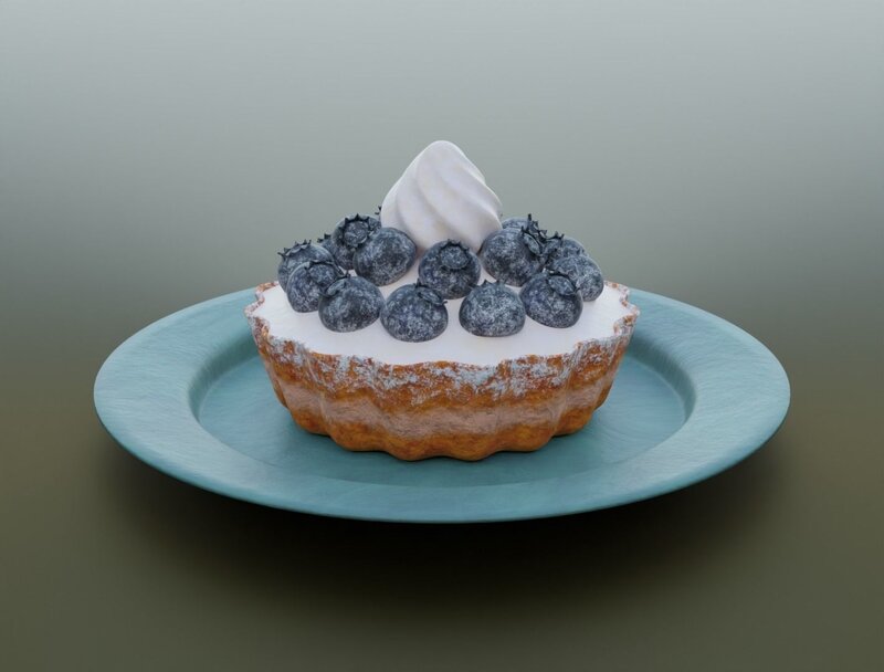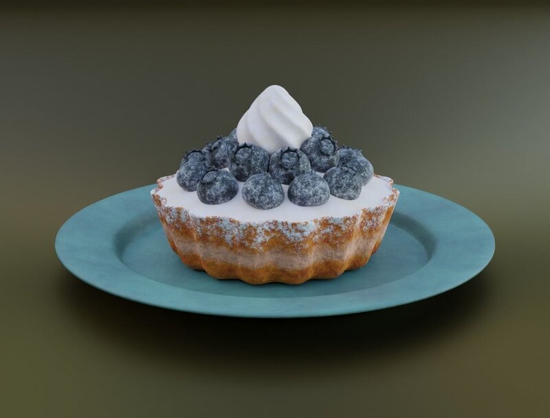 The content itself is a high-poly model of a cake with blueberries and cream just like you see in it, and also contains several materials that you can see in the images that the cake has some places sprinkled with powdered sugar. The model also has its own UV scan and several materials.
