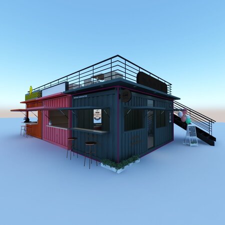 Concept of fast food container restaurant. Furniture set, stairs on top, potted plants, cash machine, various decorative elements.