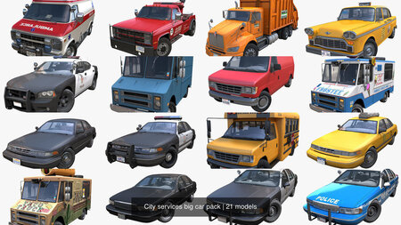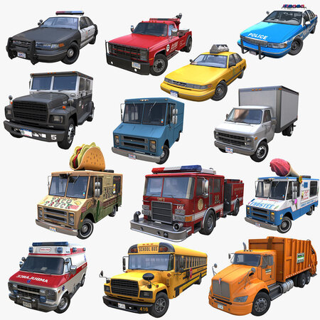This collection includes police cars, taxi, vans, box truck, fire engine, garbage truck, food trucks, school buses, sedan, TV van.Models ready for real-time apps, games, virtual reality and augmented reality.Asset looks accuracy and realistic and become a good part of your project.