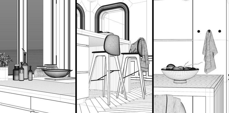 All my Cinema 4D and Corona scenes are hand made polygon by polygon and include light setup, materials, textures, camera settings, final PSD with adjustment layers (if needed), furniture and props with a high level of detail. You can use them to improve your visualizations or learn from the files, moving inside the project, observing how light was created and handled, how materials are developed, and the values that fill every single option.