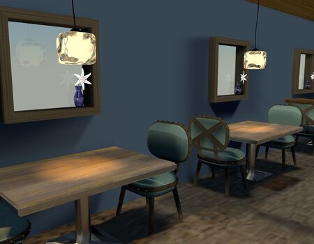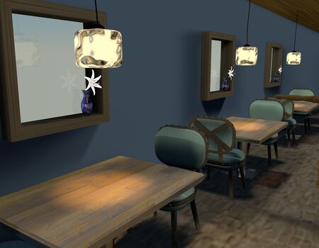 This is a cornor of a restaurant/ cafe, equipped with ice cube lamp, vintage green velvet chair,solid wooden table, patterned brown carpet, and a bit high square windows to catch the daylight while keep cutomers unbothered.