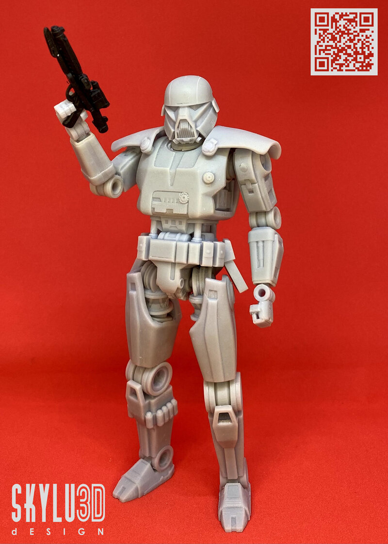 This is the Dark Trooper Droid 1/12 scale figure that fit the black series line, test printed with good enough tolerance to the articulations for posing. The design include interchangeable hands and blaster arm upgrade.