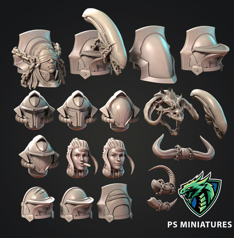 5 Shoulder pieces are designed to be used as mounts for skulls and heads from other packs. 2 Shoulder pieces have a faction icon and alien head preattached.