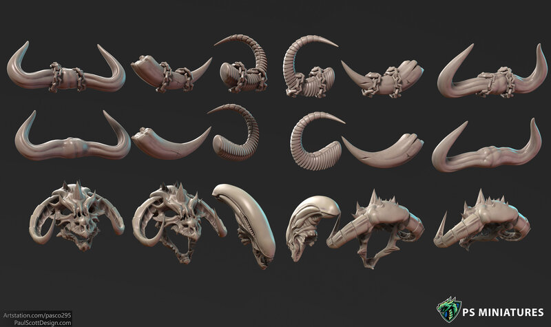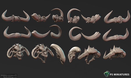 The 3 Horn types have 2 variants each with chains for mounting on models and the 3 skulls can be mounted onto shoulderpads.