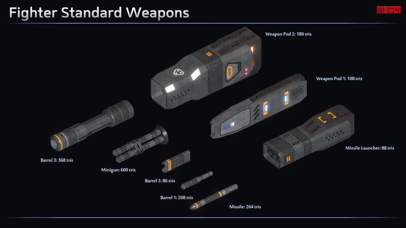Scifi bomber Modular design 5 barrels, missile launcher + missile, 2 weapon pods 6 different texture sets PSD with intact layers is included PBR textures Texture sizes are 4096 (ship) and 1024 (weapons) Tris count ca. 1300 Final tris count depends on how many weapons are used for the ship